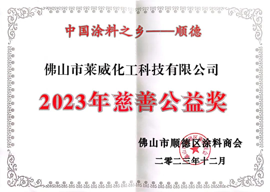 佛山市萊威化工科技有限公司作為順德涂料商會(huì)會(huì)員單位及理事單位應(yīng)邀出席。在慶典上,萊威化工公司憑借其在公益事業(yè)中的突出貢獻(xiàn),一舉攬獲2023年慈善公益獎(jiǎng)。作為佛山市一家**的化工企業(yè),萊威化工公司自成立以來(lái)一直秉承“責(zé)任、創(chuàng)新、發(fā)展”的企業(yè)理念,積極履行社會(huì)責(zé)任,關(guān)注環(huán)保、公益事業(yè)。公司不僅在生產(chǎn)經(jīng)營(yíng)方面取得了顯著成績(jī),更在公益領(lǐng)域展現(xiàn)出高度的社會(huì)責(zé)任感。這一獎(jiǎng)項(xiàng)是對(duì)公司在公益事業(yè)中的突出貢獻(xiàn)的認(rèn)可和表彰。